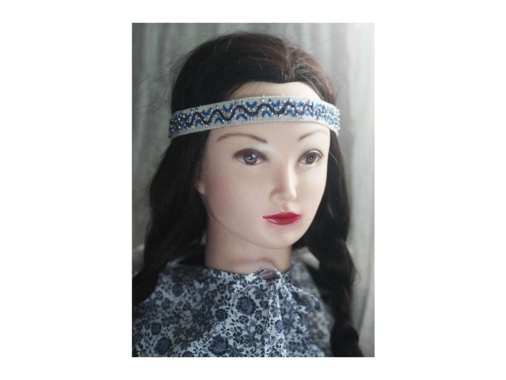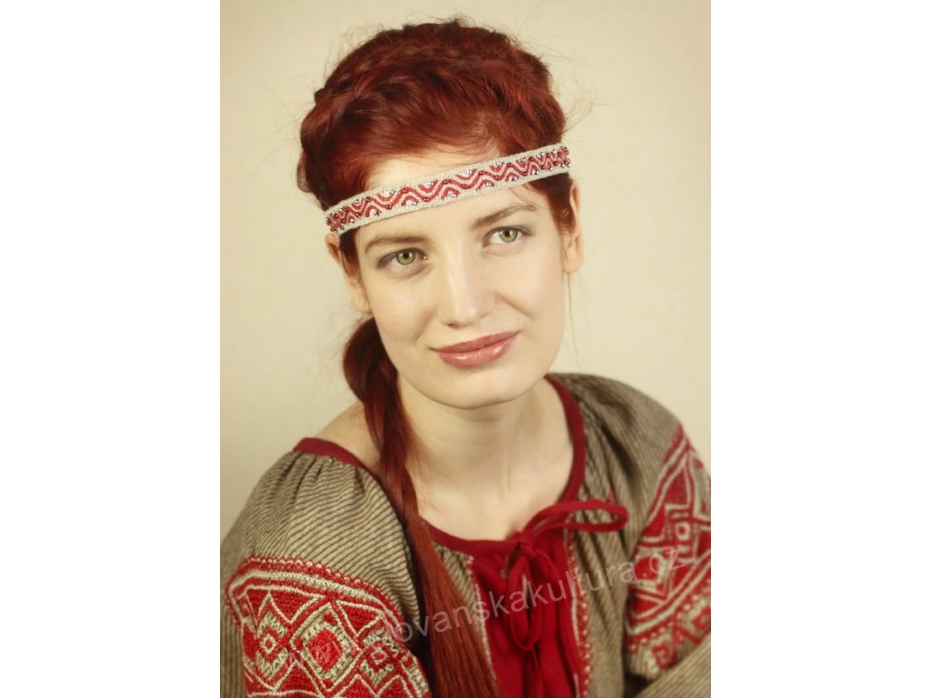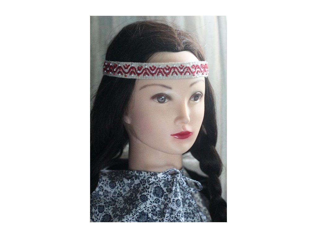 Ručně vyšívaná lněná čelenka s korálky, vzadu je tkanička na uchycení na hlavě.