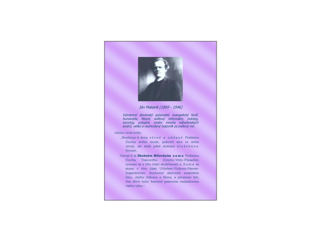 Útlý spis Jána Maliarika ukazuje jaké jsou úrovně jsoucna. Od hmoty až po nejvyšší Absolutní Všesebevědomé Vědomí. A každé úrovni přiřazuje pomyslnou matematickou hodnotu, abycho měli alespoň trochu představu o jejich poměru.